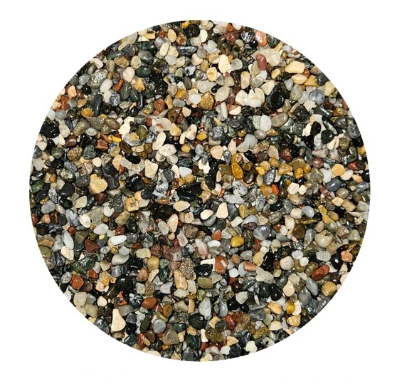 Farklı renklerde küçük 3-5mm çakıllardan oluşan nehir kumu.