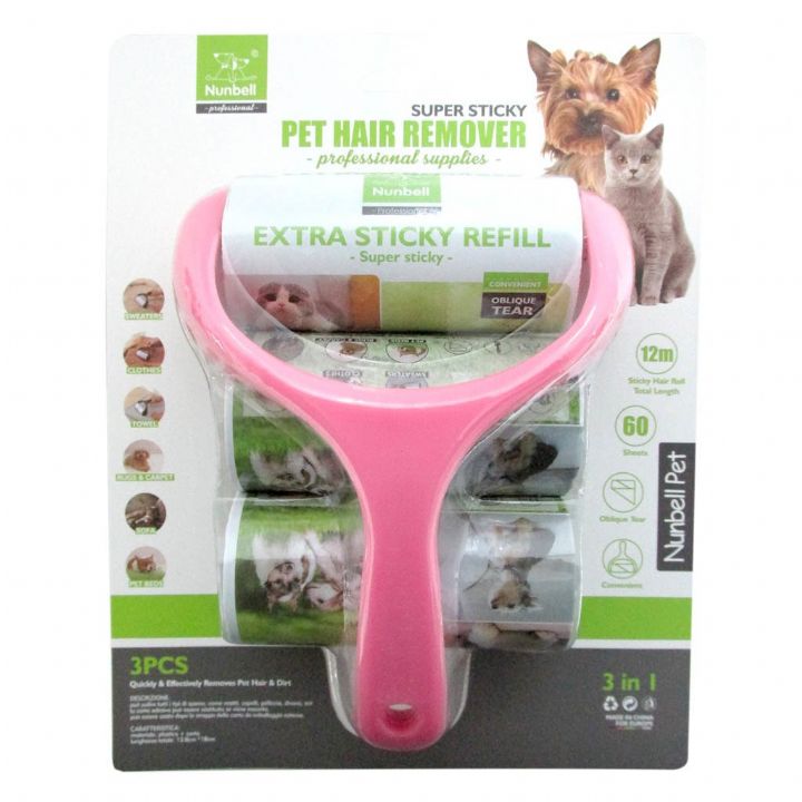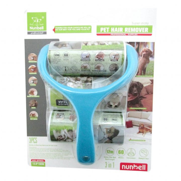 Evcil hayvanlardan yaşam alanlarımıza dökülen tüyleri kolay ve zahmetsiz bir şekilde toplamak için hazırlanmış, 2 adet yedek rulosuyla beraber toplam 180 yaprak yapışkandan oluşan Nunbell Kedi Köpek Tüy Toplama Rulosu