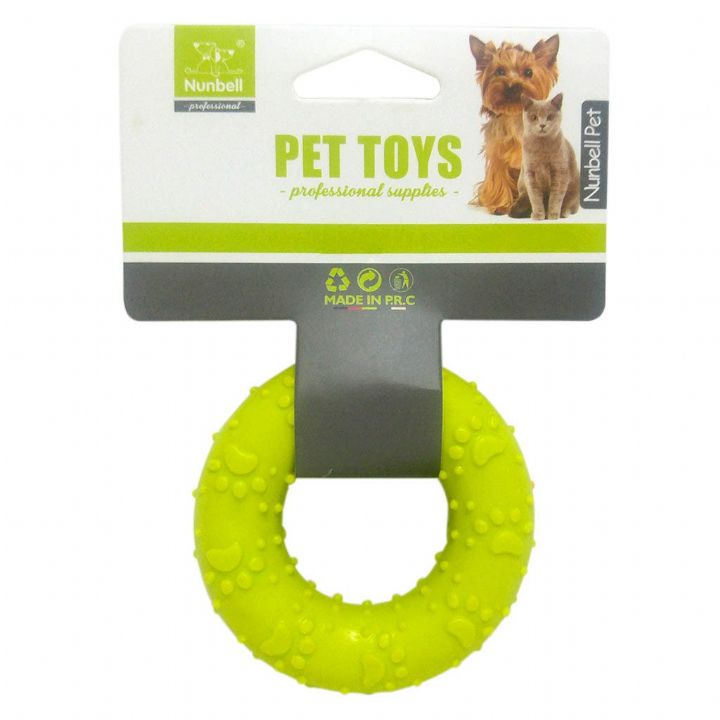 Köpekler için özel olarak dayanıklı elastik materyalden üretilmiş, çember formunda, üzerinde kabartmalı pati desenleri bulunan Nunbell diş kaşıma & köpek oyuncağı.